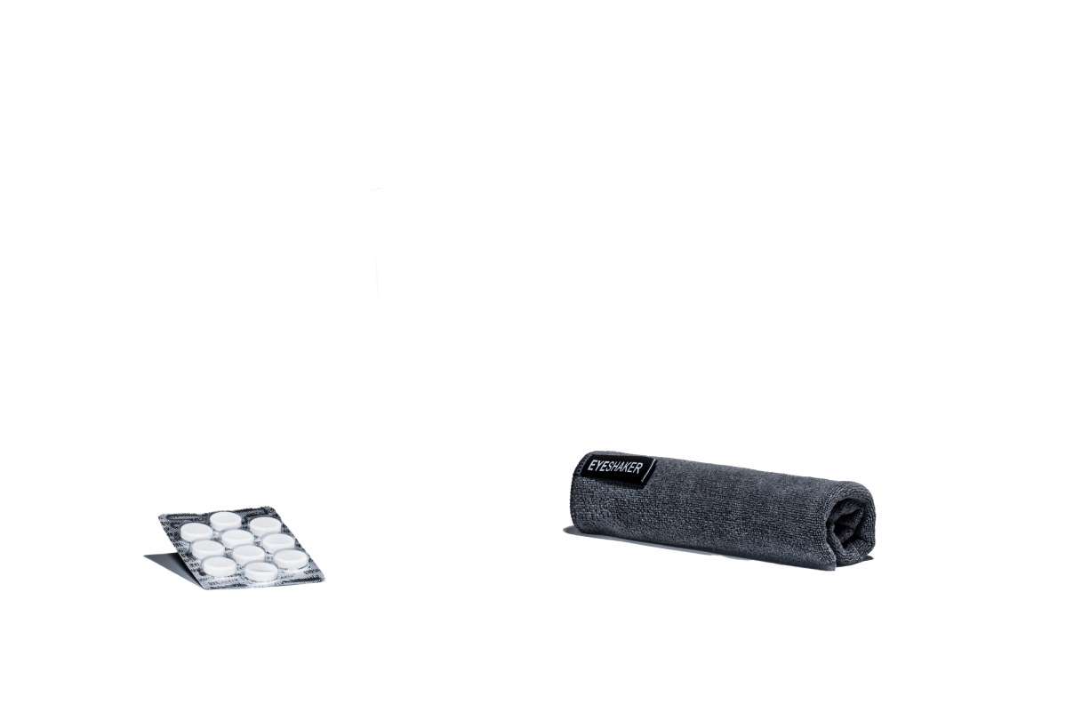 Alles, was du zum Brillenglück brauchst! Das EYESHAKER-Set mit EYESHAKER, 10 Cleaning Tabs und EYESHAKER Mikrofaserhandschuh.